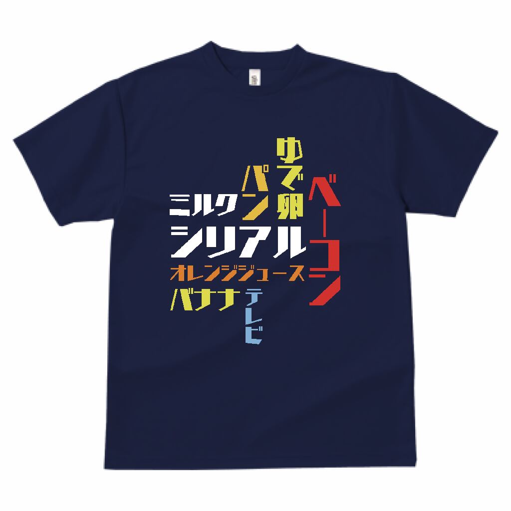 このTシャツは、私が勝手にイメージした外国の朝ごはんの風景を文字で表現しています。それはただの洋食ではなく、朝ごはんの多様性や魅力を想像し、自分なりのストーリーを織り交ぜました。